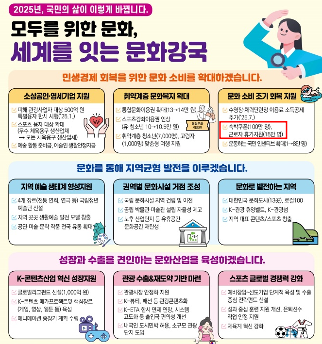 일상 속 문화생활이 부담되시나요? 물가상승으로 여행은 커녕 문화생활조차 망설이게 되는 요즘입니다. 저도 같은 고민을 했었는데요, 다행히 문화체육관광부에서 2025년에도 다양한 지원정책을 마련했다고 합니다. 숙박할인권부터 문화누리카드까지, 우리가 놓치지 말아야 할 혜택들이 가득한데요. 특히 올해는 지원 규모가 대폭 확대되어 더 많은 분들이 혜택을 받으실 수 있습니다. 지금 바로 신청하지 않으면 나중에 후회할 수 있으니, 함께 자세히 알아보도록 할까요?