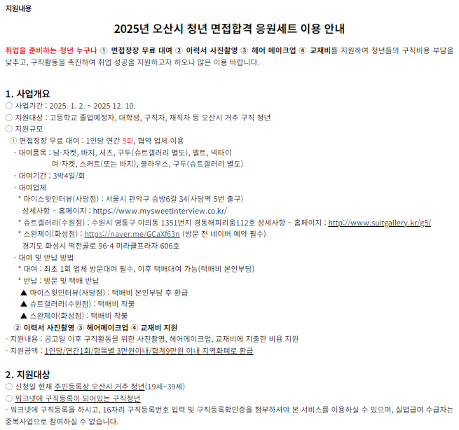 | 필요서류 | 1. 신청서 및 개인정보활동의서(온라인 작성) 2. 주민등록초본 (마이데이터 연동 또는 직접 첨부) 3. 채용공고문 4. 면접확인서 도는 면접확인서 대체서약서 |