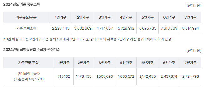2024년 및 2025년 기준 중위소득 (단위: 원/월)