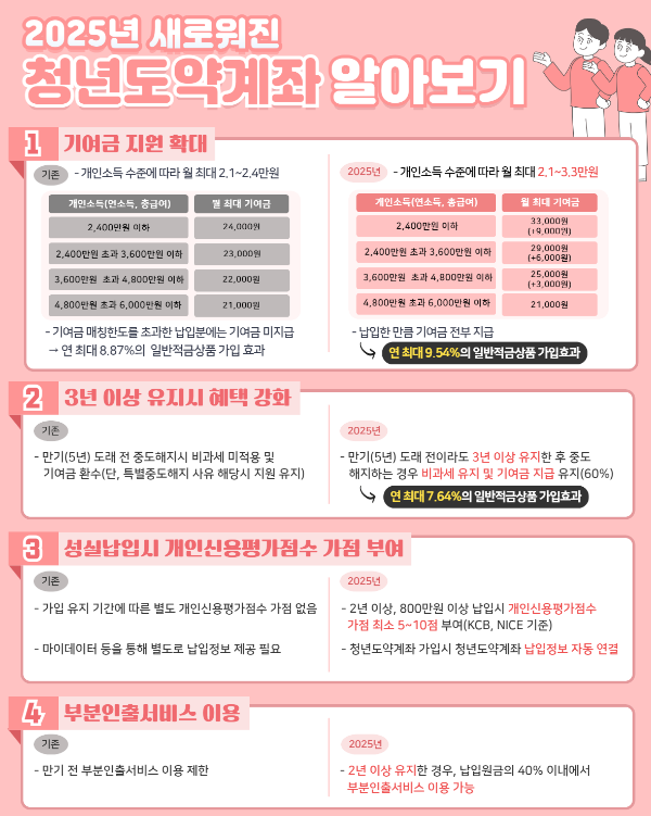 2025년 1월부터는 정부 지원금 혜택이 더욱 확대되었습니다. 모든 소득구간에서 납입한도인 월 70만원까지 기여금을 받을 수 있게 되었고, 확대된 구간에는 3.0%의 매칭비율이 적용됩니다. 이에 따라 가입자가 받을 수 있는 월 최대 기여금이 2만 4천 원에서 3만 3천 원으로 증가했습니다.
